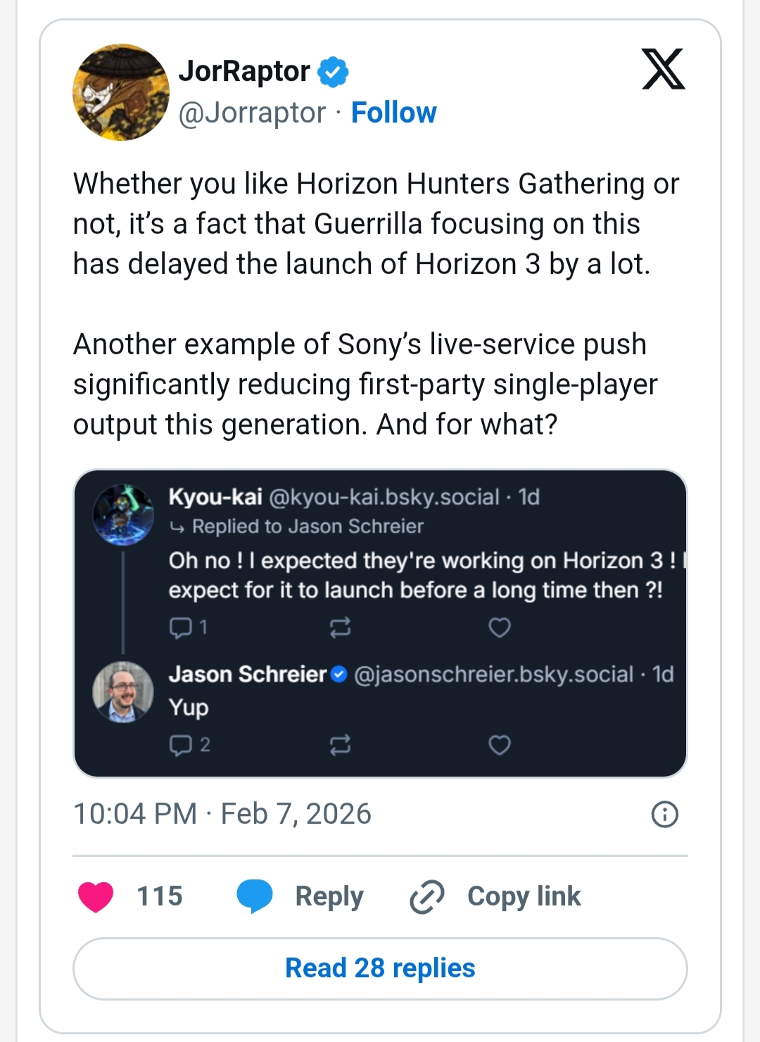 一个残酷的事实,过去4年游骑兵基本都在搞新公布的hunter gathering,地平线3遥遥无期。我知道泥潭大部分人对这个系列无感,但这个消息或许揭示了索尼的态度:即使销售成绩很好的标杆ip,优先级依然不如服务型游戏,其他ip或工作室随时有可能也发生这种转变,这还是建立在ps4时代第一方3A大获成功的基础上,如果某个游戏不幸翻车,比如死亡搁浅2,后续投入可能更加困难,我怀疑physint的开发会受到阻碍